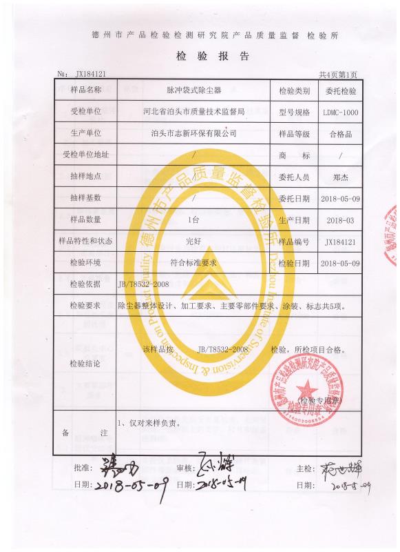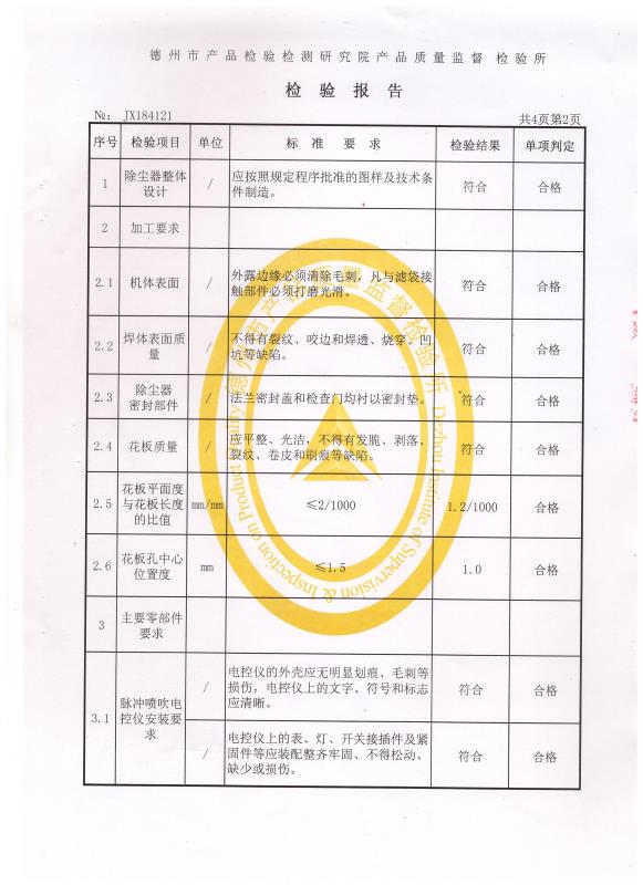 | 受檢產(chǎn)品 | 脈沖袋式除塵器 |