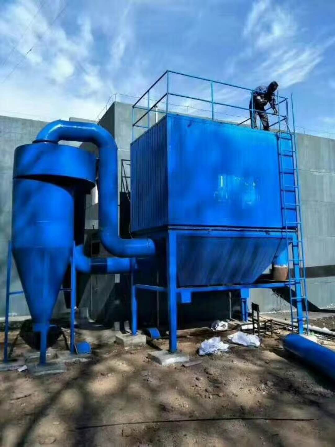 4、設(shè)備完畢后的花板要用帆布逐步蓋住,避免雜物落入袋式除塵器中。噴吹管設(shè)備時也要用帆布蓋好花板,避免損壞布袋除塵器口。